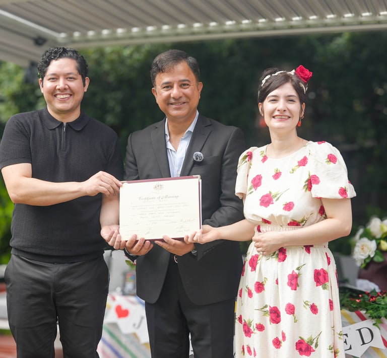 The Monitum & Legal Vows: I recite the required legal words with the same reverence as I explain traditional rituals. They become a formal promise to each other under Australian law, surrounded by the blessings of your heritage.